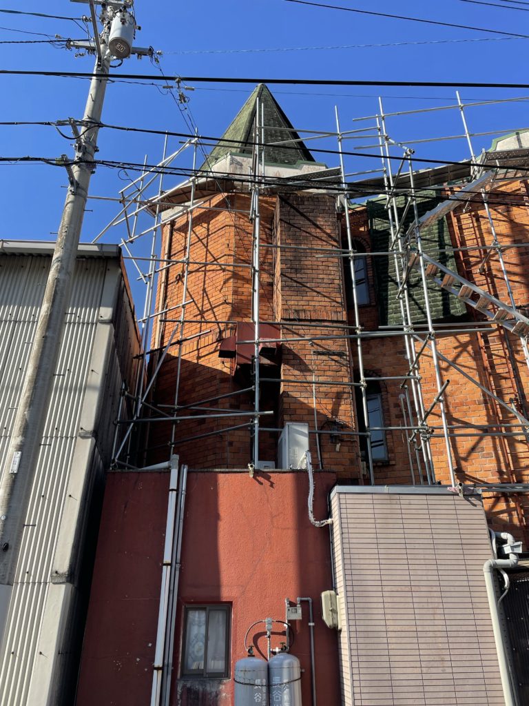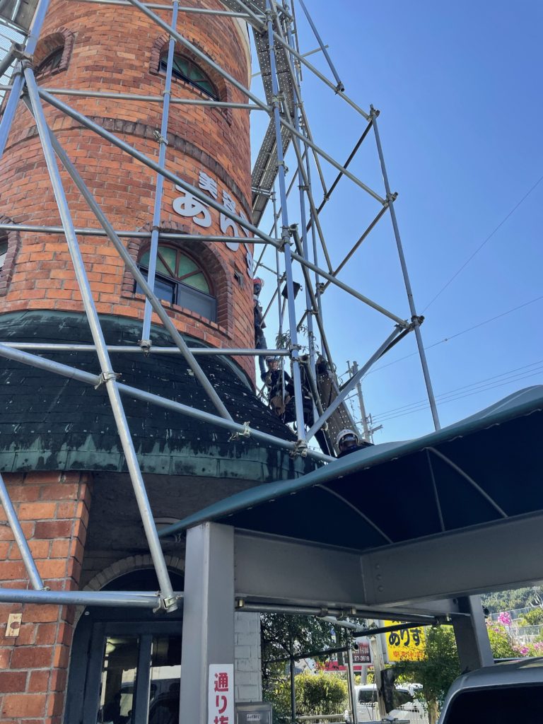建物の国道側にはバラ等のお花も植えられており、今回の足場を利用して伸びてしまったバラの手入れもできたときいて、切ってしまうのは勿体ない気もしましたが「またすぐ花を咲かせるよ」と笑顔でお話されていたのがとても印象的でした。バラがまたたくさん咲くのを楽しみにしてます♫